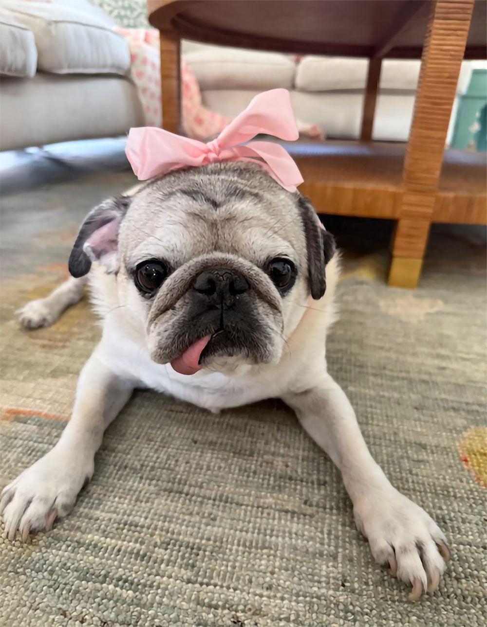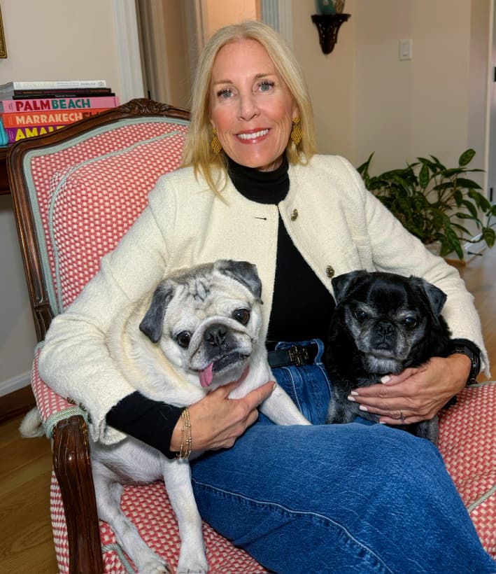 I’m a proud mom of three nearly-grown kids, each charting their own path—two practical, one wildly creative, all stitched into my needlepoint lifestyle. I also share my studio with two of my best friends, Ted and Iz, my two pugs who supervise all stitching operations.